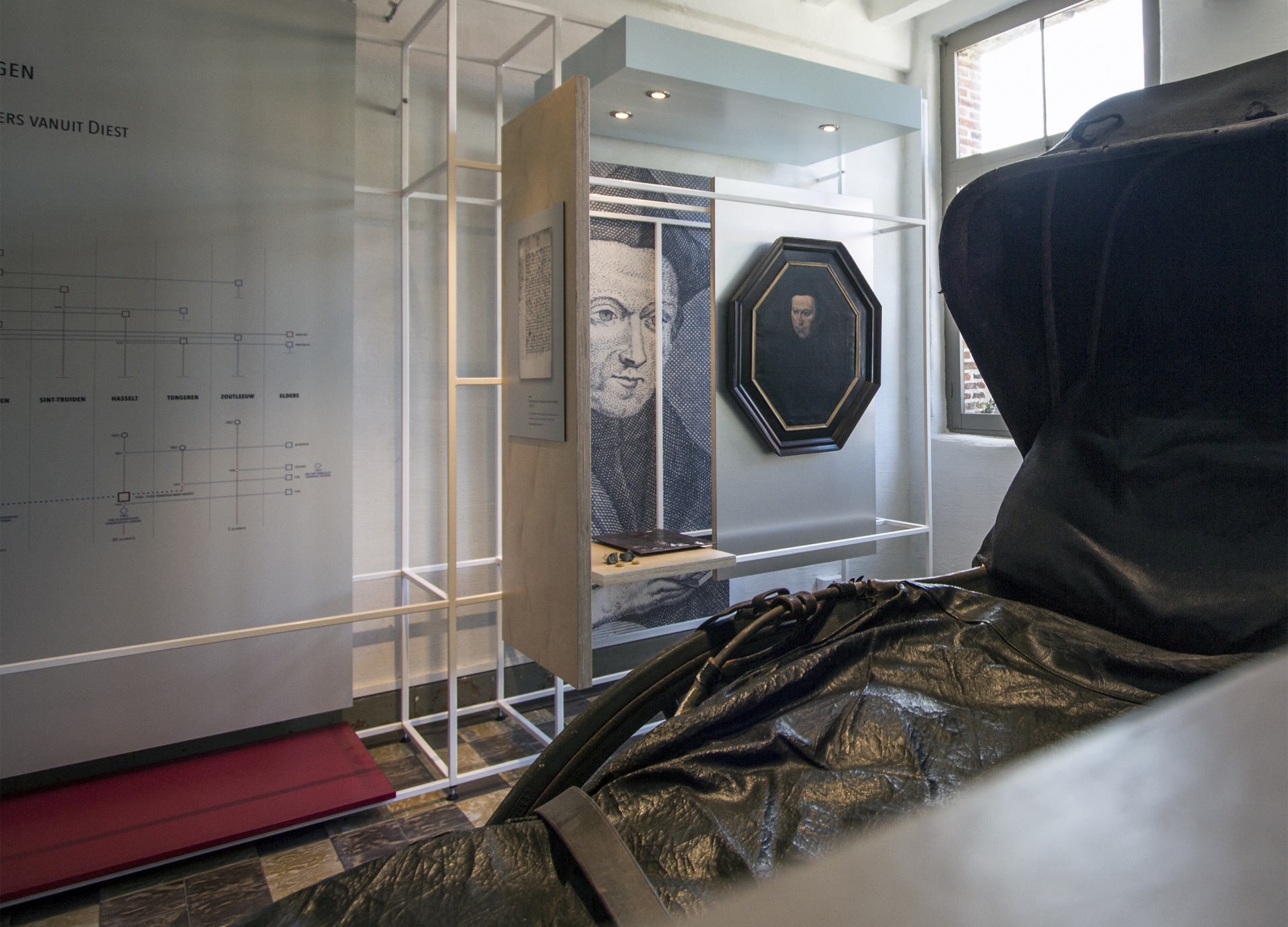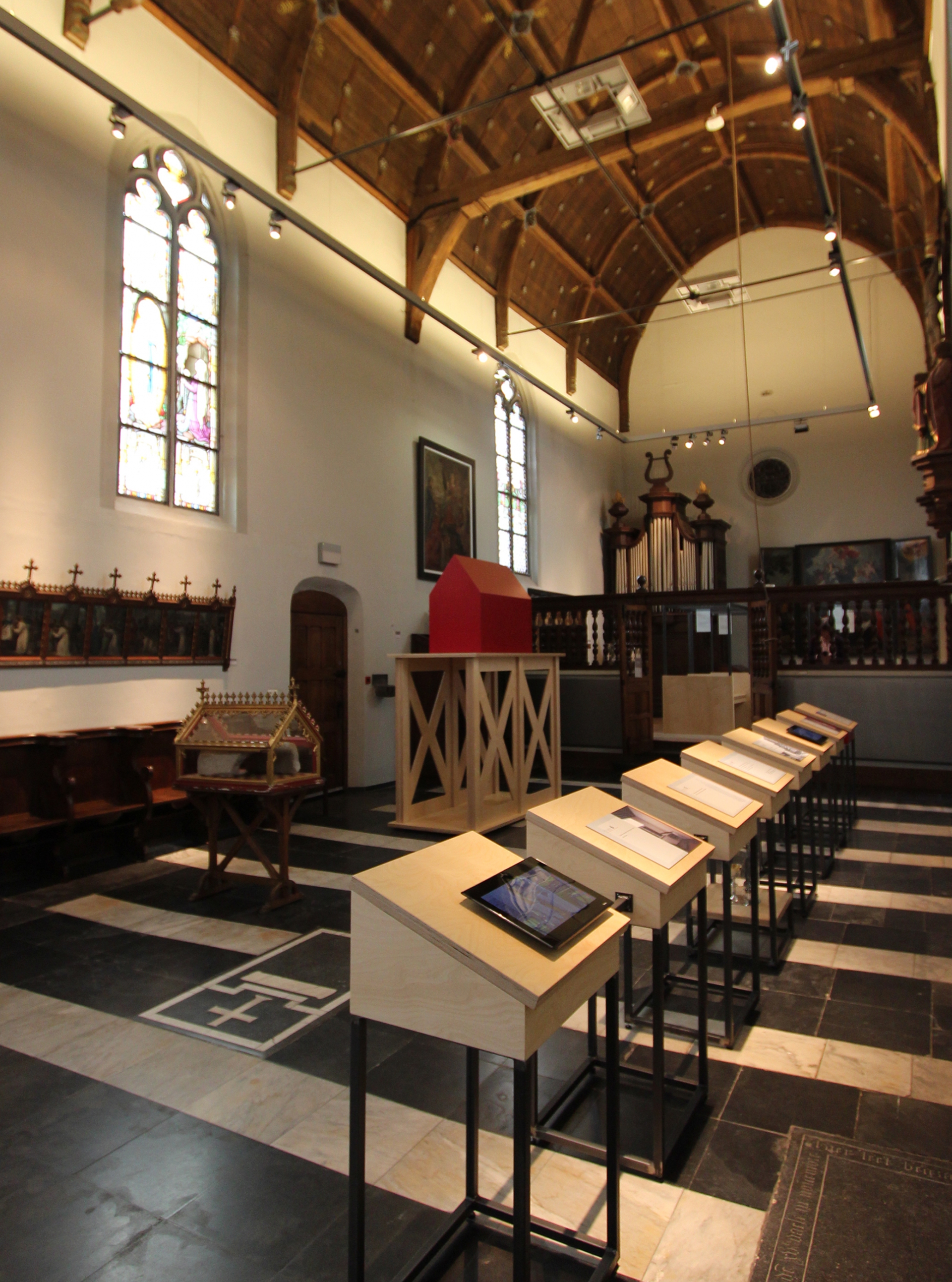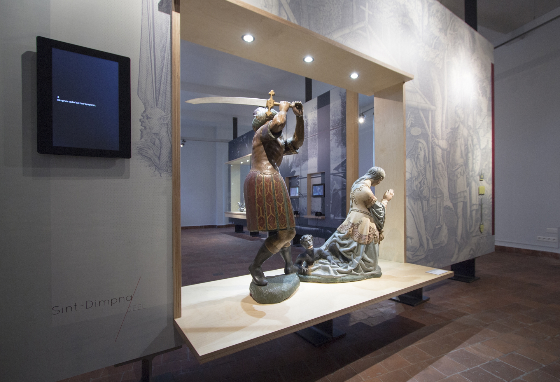 - in de grote zaal ontwerpen we volumes voor de topstukken (het zilveren reliekschrijn en de beeldengroep rond Dimpna)