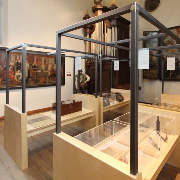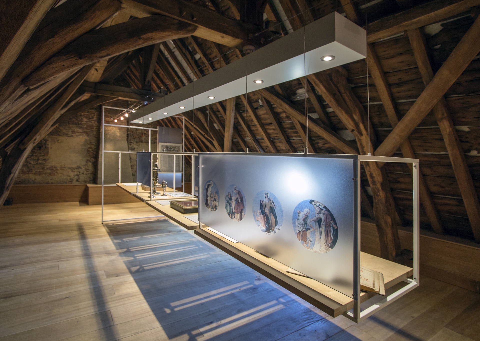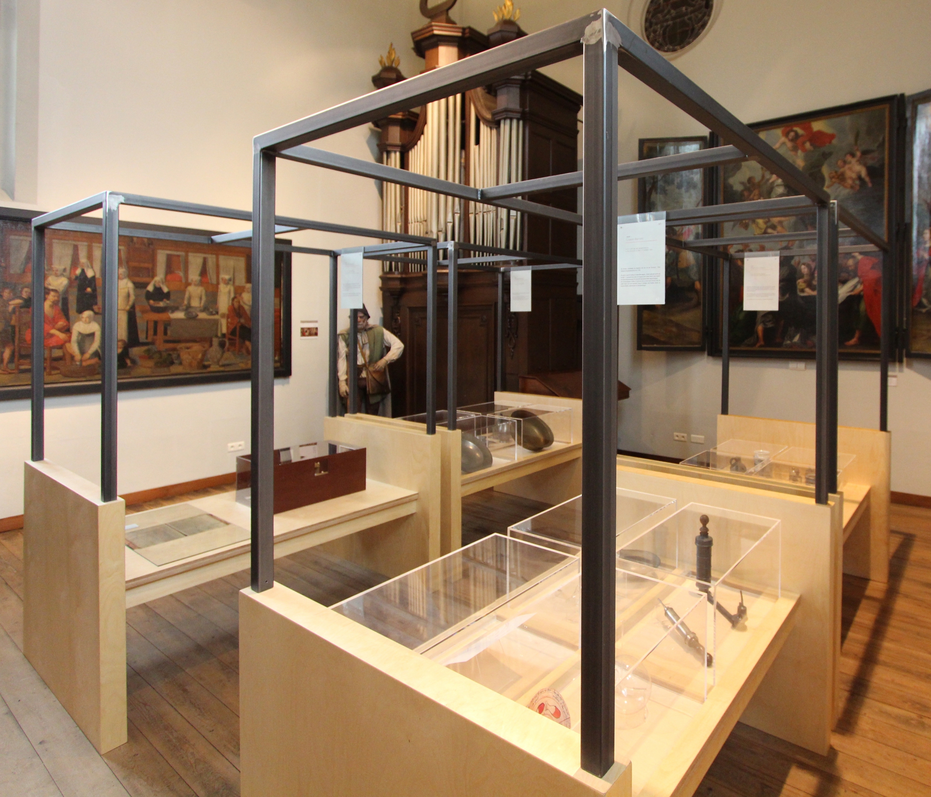 - in de grote zaal ontwerpen we volumes voor de topstukken (het zilveren reliekschrijn en de beeldengroep rond Dimpna)