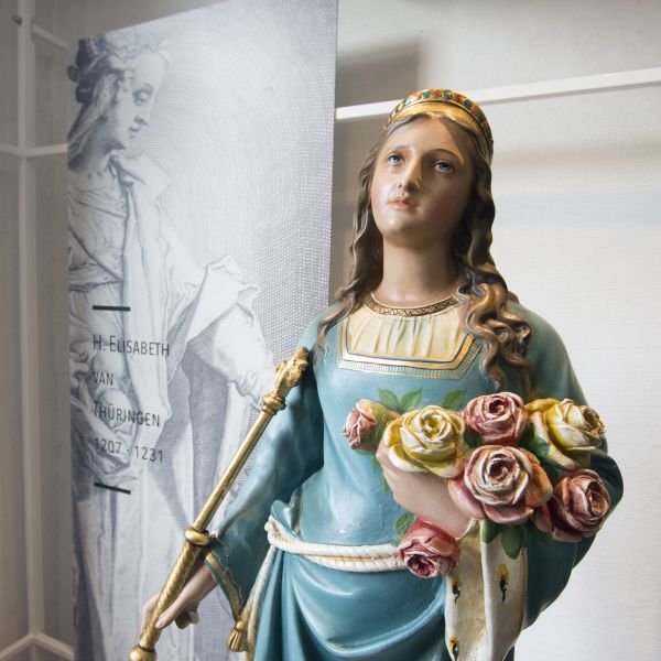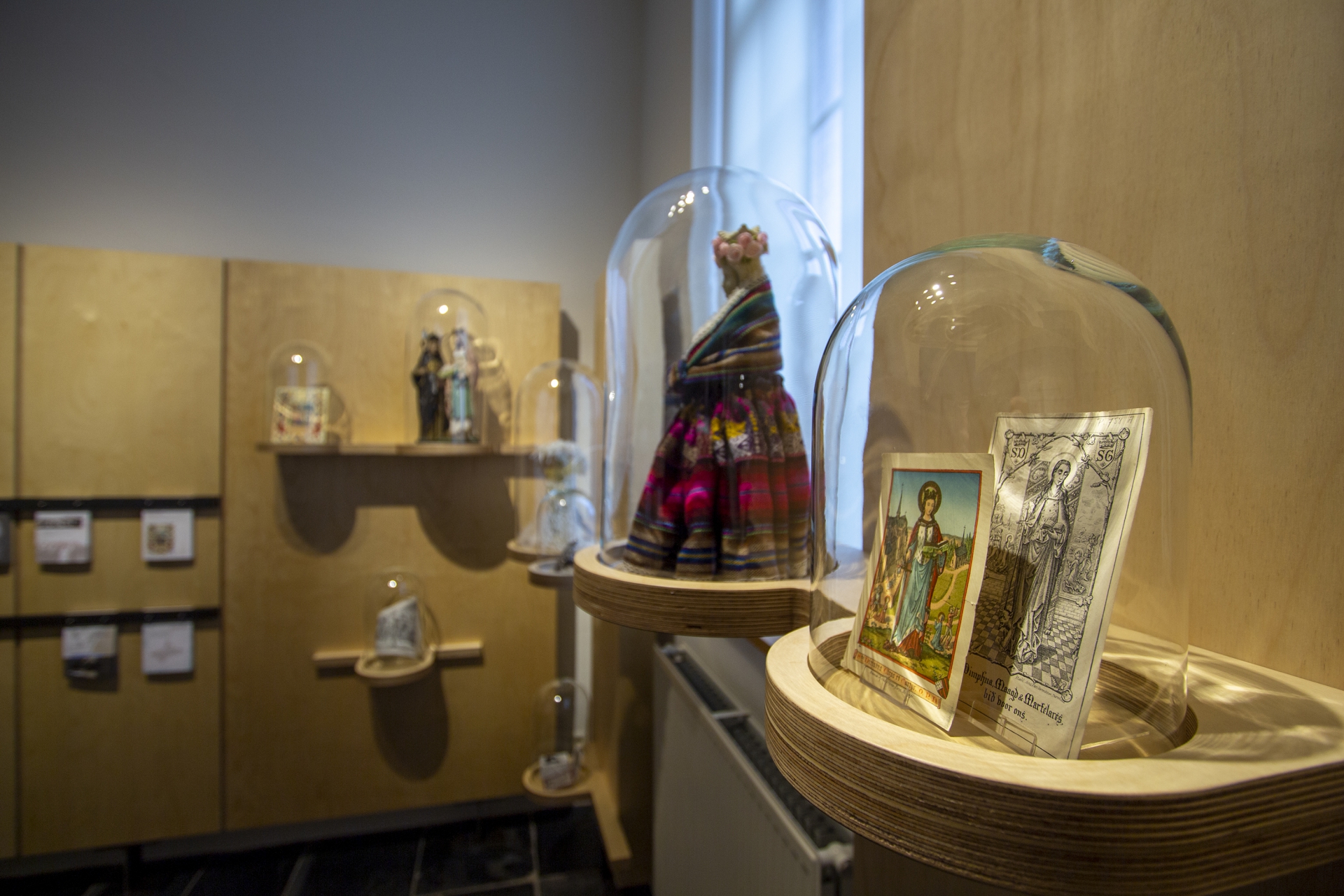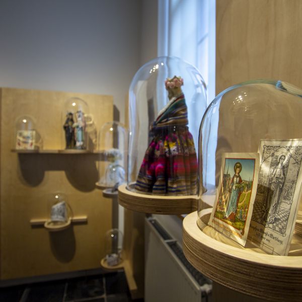 - de verering van Dimpna tonen we met devotieprenten en -medaillons en ‘prullaria’ die werelwijd verkocht worden