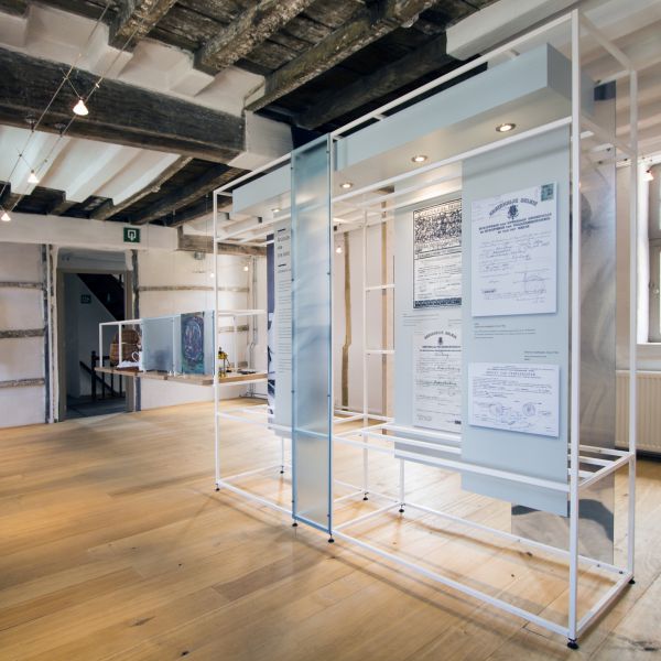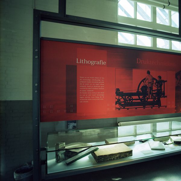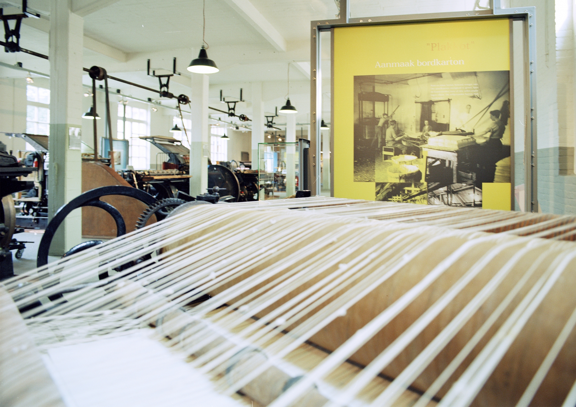 De grootformaatpanelen in een ruimtelijke opstelling vertellen de productie van de speelkaarten in al zijn facetten en geven toelichting bij de machines.