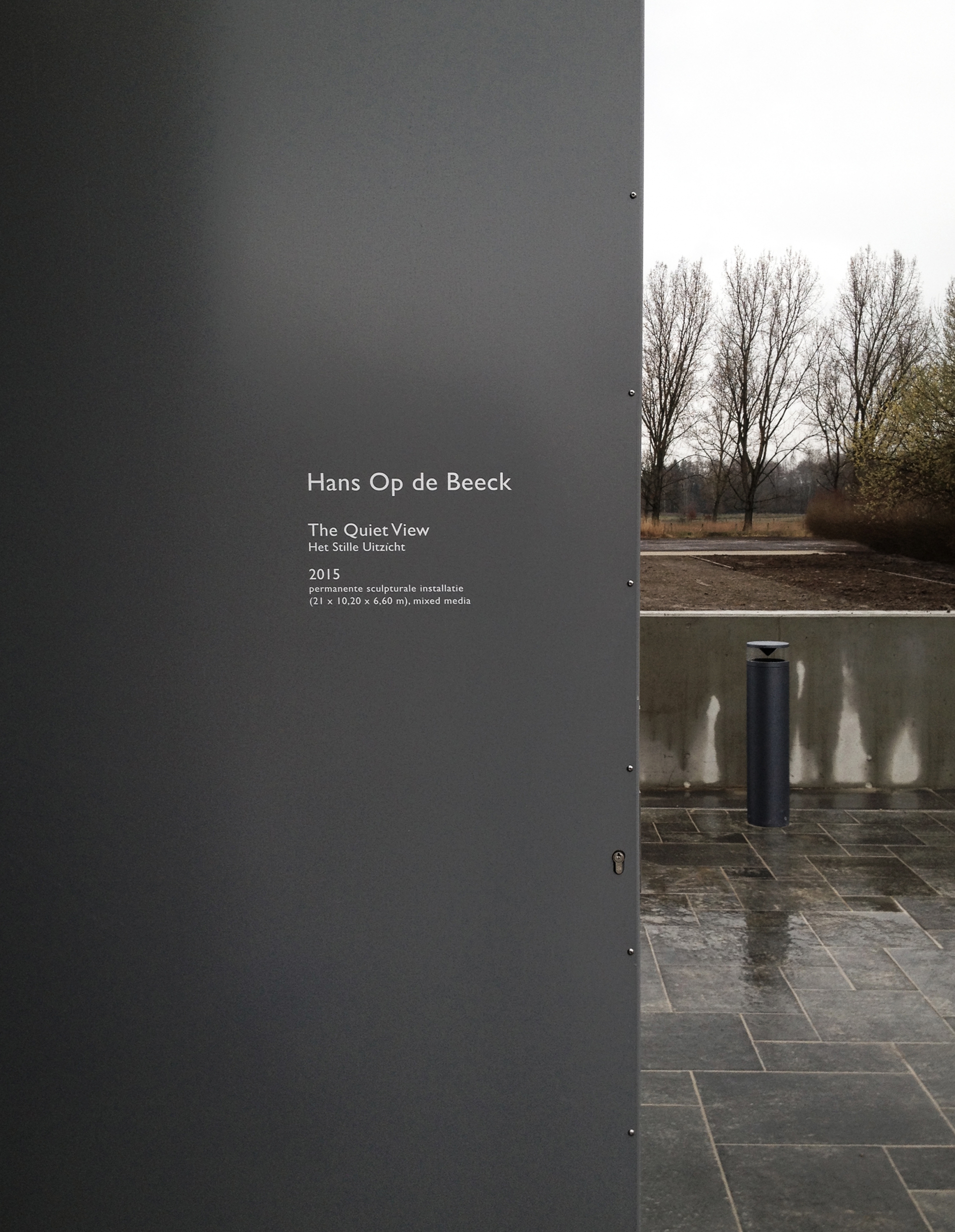 'The Quiet View' biedt je een panoramische blik op een eindeloos landschap. Eens je binnen in de grote constructie op de bank gaat zitten, kijk je naar een installatie die een weerbarstig landschap oproept van grijze rotsen en kale bomen dat zich eindeloos lijkt uit te strekken. Op de Beeck gebruikt spiegels om dat trompe-l’oeileffect te bereiken, een gevoel van diepte wordt versterkt door het gebruik van een overdreven perspectiefwerking.