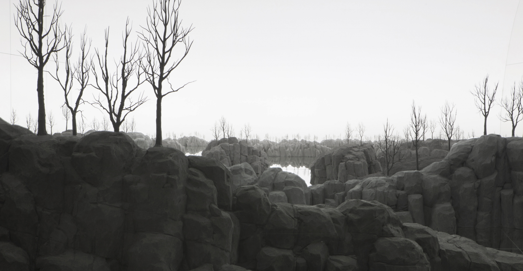 De keuze voor een grijs landschap is bewust. ‘Misschien doet het denken aan Arizona onder water, of de omgeving van Ieper na de Eerste Wereldoorlog’, zegt Op de Beeck. ‘Ik wilde niet met kleur werken, want dan zou ik in competitie gaan met de prachtige omgeving buiten, een strijd die ik sowieso zou verliezen. Het is een fictief landschap, een plaats om je gedachten te laten stromen of even te vergeten.’